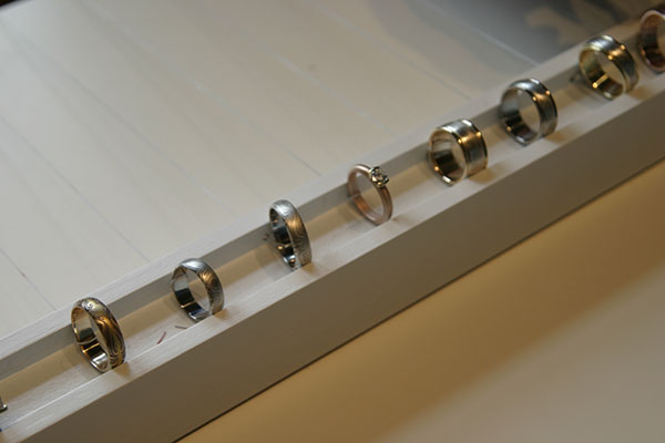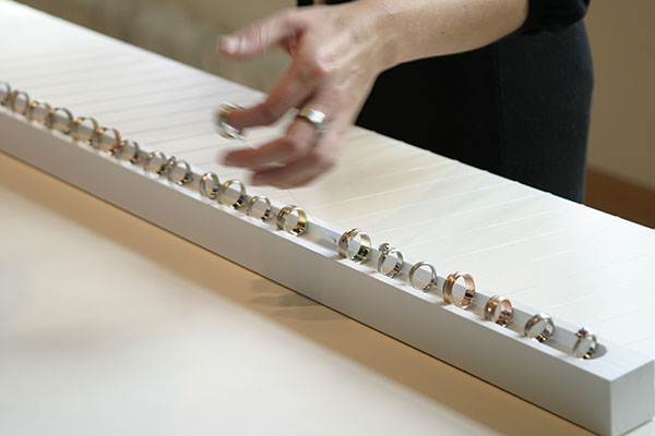 Love Rings True was a showcase of Studio Vincent's extraordinary and very modern Wedding Collection. An Exclusive, invitation only event was designed to create a unique guest experience. We proposed to SV to design an interactive open jewelry case. The interactive case would allow guests to try-on and "play" with the wedding ring collection. The rings were presented in an open case, invisibly attached by a system of filament and weights, threaded through a centered ring-holder. Guests could pull out a ring, try it on, admire while sipping champagne