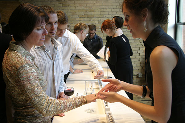 Love Rings True was a showcase of Studio Vincent's extraordinary and very modern Wedding Collection. An Exclusive, invitation only event was designed to create a unique guest experience. We proposed to SV to design an interactive open jewelry case. The interactive case would allow guests to try-on and "play" with the wedding ring collection. The rings were presented in an open case, invisibly attached by a system of filament and weights, threaded through a centered ring-holder. Guests could pull out a ring, try it on, admire while sipping champagne