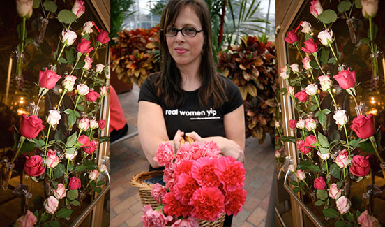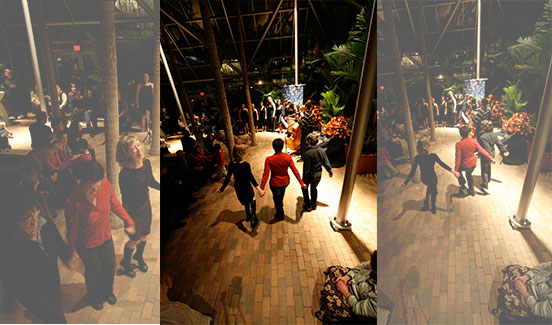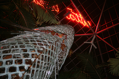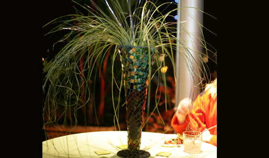 The Cowels conservatory has a modern Gothic Cathedral ambiance,. It is filled with lush foliage and sky high palm trees. A large serpentine-like pool winds through the center. A whimsical glass scaled Frank Gerry fish sculpture splashes out of the pool. We built the event experience around this tropical and maze-like setting to create a dance, feasting, and concert party. High-top tables were covered in every imaginable shade of green. Mini palm tree inspire centerpieces were made of fluted mosaic glass vases, topped with beargrass and lit with micro fiber optics, to meld into the tropical paradise. A Bulgarian "valley of the roses" was recreated by suspending multicolored pink roses on the glass surround walls.